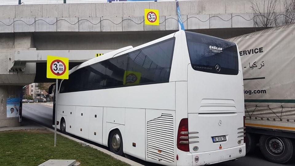 Otobüs ile TIR aynı anda üst geçide sıkıştı