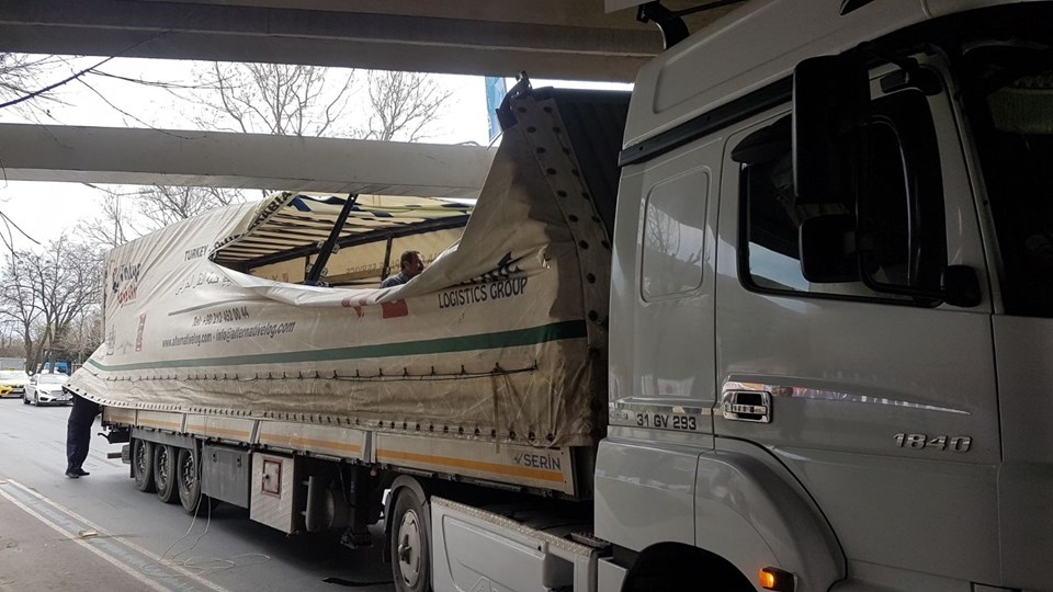 Ataköy'de bir TIR ile otobüs üst geçide sıkıştı. Araçları kurtarmak için çalışma başlatıldı.
