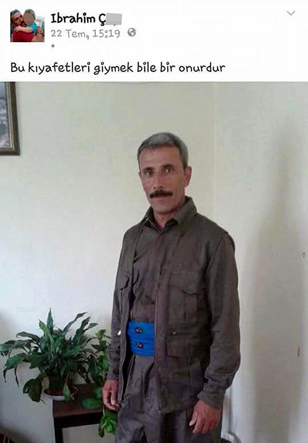 Muğla’nın Seydikemer'in Kumluova Mahallesi'nde serada çalışan İbrahim Ç.'nin sosyal paylaşım sitesi Facebook'ta paylaştığı fotoğraf ortalığı karıştırdı. İbrahim Ç.'nin 'Bu kıyafeti giymek bile onurdur' notuyla paylaştığı fotoğraftaki kıyafeti PKK dağ kadrosunun kıyafetine benzetildi. Fotoğraf kısa sürede çok sayıda kişi tarafından paylaşılarak İbrahim Ç.'nin bulunması istendi.