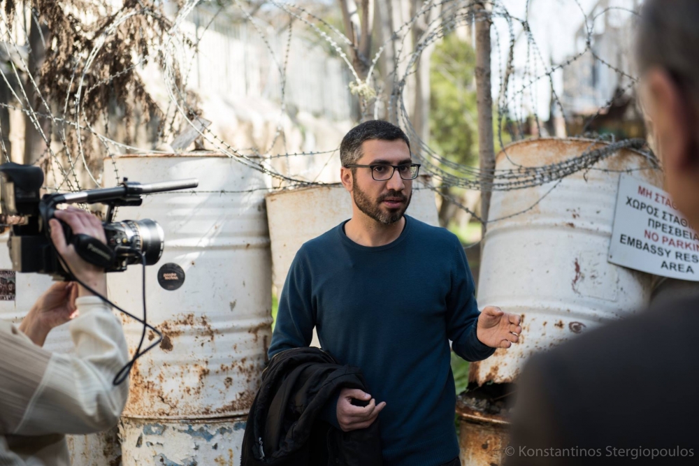 Günler öncesinden yapacağı eylemi sosyal medya üzerinden duyurmaya başlayan Tringidis ve iki arkadaşı, saat 11.00 civarı Baf Kapısı'nın kuzeyinde bulunan harap haldeki evin penceresindeki kum torbalarını indirmeye çalıştı.