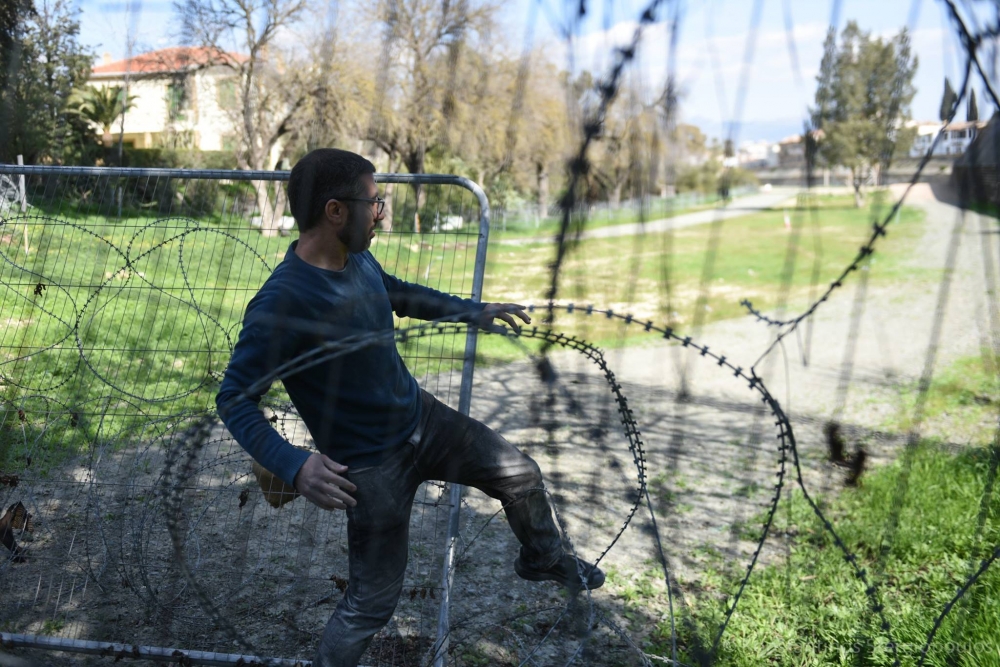 Günler öncesinden yapacağı eylemi sosyal medya üzerinden duyurmaya başlayan Tringidis ve iki arkadaşı, saat 11.00 civarı Baf Kapısı'nın kuzeyinde bulunan harap haldeki evin penceresindeki kum torbalarını indirmeye çalıştı.