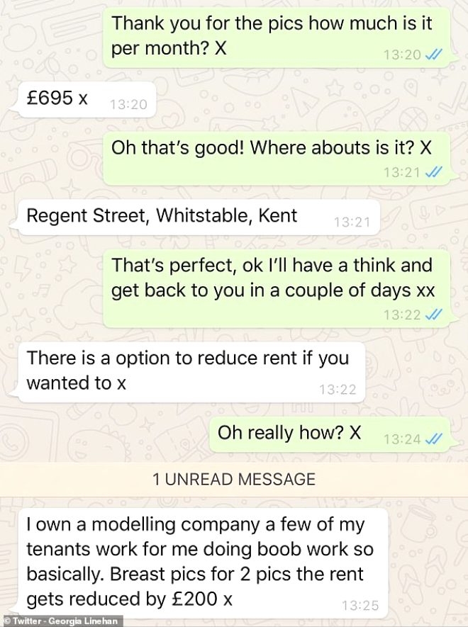 İngiltere'nin Canterbury şehrinde yaşayan 1 çocuk annesi Georgia Linehan, kiralamak istediği evin sahibi ile pazarlık yaparken aldığı iğrenç teklifle neye uğradığını şaşırdı.