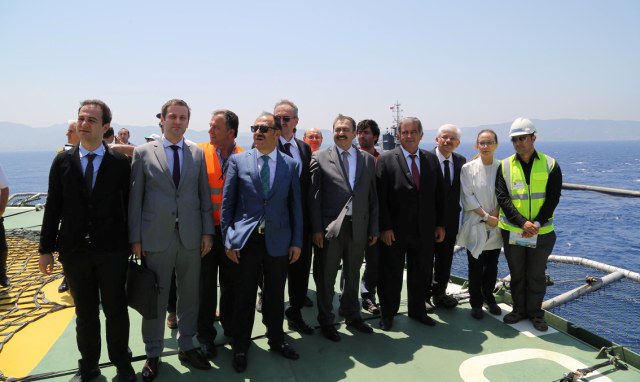 Güzelyalı’dan 5 km açıkta Deniz Geçişi İsale Hattı’nın montajlarının yapıldığı gemilerden birinde düzenlenen törene Türkiye Orman ve Su İşleri Bakanı Veysel Eroğlu, Tarım Doğal Kaynaklar ve Gıda Bakanı Önder Sennaroğlu, TC Lefkoşa Büyükelçisi Derya Kanbay, TC Devlet Su İşleri Genel Müdürü Ali Rıza Diniz ve Deniz İsale Hattı’nın ihalesini üstlenen şirket temsilcileri katıldı.