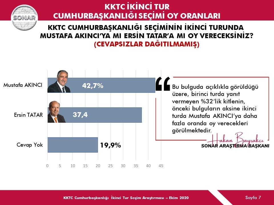 SONAR Araştırma Şirketi'nin sahibi Hakan Bayrakçı KKTC 2.TUR Cumhurbaşkanlığı seçimi anketini açıkladı...Ankettte Akıncı %53,3 oy ile seçimi kazanıyor