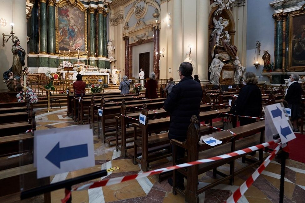 İspanya'nın Madrid kentindeki Santa Barbara Kilisesi'ndeki bir ayinde, sosyal mesafe için sıralara bantlar çekildi.