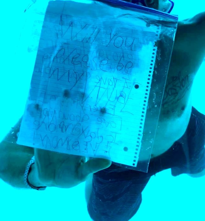Kız arkadaşına sürpriz bir evlilik teklifi yapmayı planlayan genç, sevgilisi odadayken suya dalıp odanın penceresine romantik bir not yapıştırdı.