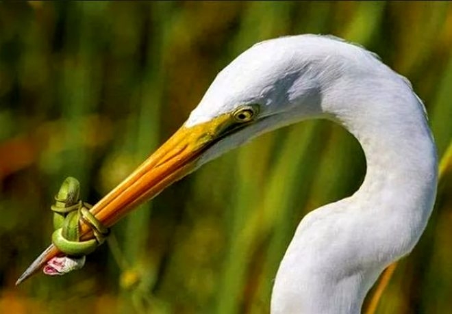 ABD'nin Florida eyaletinde, beyaz balıkçıl ve bir yılan arasındaki kavgayı gösteren bir kare.