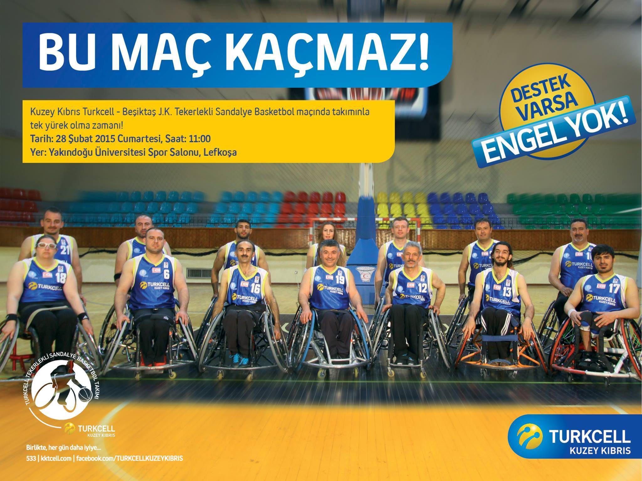 Kadın ve erkek sporcuların sahada birlikte mücadele verdikleri tek spor dalı olan tekerlekli sandalye basketbolunda Kıbrıs Türk sporcusuna uygulanan ambargoları kırarak Türkiye ve Avrupa arenasına önemli bir açılım yapan Kuzey Kıbrıs Turkcell Tekerlekli Sandalye Basketbol Takımı’nın YDÜ Kapalı Spor Salonu’nda Beşiktaş Jimnastik S.K ile yapacağı maçın sportif rekabet heyecanı yanında dostluk havasında oynanması bekleniyor. Maça renk katacak bir organizasyon planlayan Kuzey Kıbrıs Turkcell, çocuk seyircilere cellocan şapkaları dağıtacak. Beyarmudu Belediyesi halk dansları ekibi maç öncesi ve devre arasında gösteri düzenleyecek.