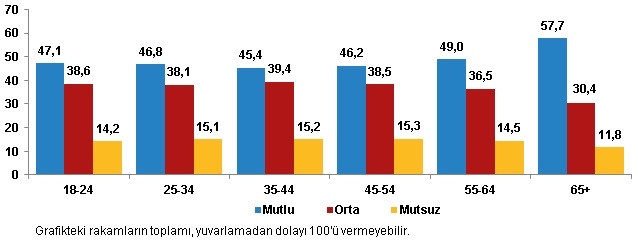 En mutlu olanlar 65 ve üzeri yaş grubunda: Yaş gruplarına göre mutluluk düzeyi incelendiğinde; 65 ve üzeri yaş grubu, 2019 yılında yüzde 58,5, 2020 yılında ise yüzde 57,7 ile en yüksek mutluluk oranının görüldüğü yaş grubu oldu. En düşük mutluluk oranı ise 2019 yılında yüzde 48,7 ile 55-64 yaş grubunda görülürken 2020 yılında yüzde 45,4 ile 35-44 yaş grubunda gözlendi.