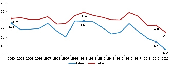 Kadınlar erkeklere göre daha mutlu: Mutlu olduğunu beyan eden erkeklerin oranı, 2019 yılında yüzde 47,6 iken 2020 yılında yüzde 43,2 oldu. Kadınlarda ise bu oran, 2019 yılında yüzde 57,0 iken 2020 yılında yüzde 53,1 oldu.