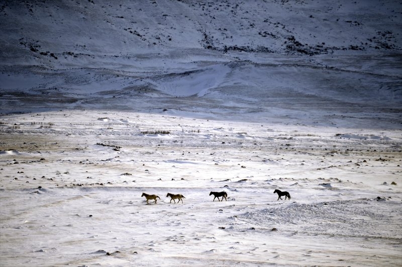 Ardahan- İl genelinde kar yağışı etkili oldu. Çıldır ilçesinde kar yağışının ardından yılkı atlar yem aradı.