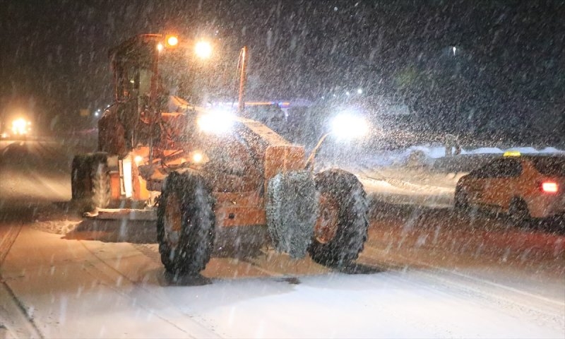 Akşam saatlerinde başlayan kar yağışı ve tipi dolayısıyla karayolları ekipleri, yolları kardan temizleyip tuzlama yaparak trafiği açık tutmaya çalışıyor.