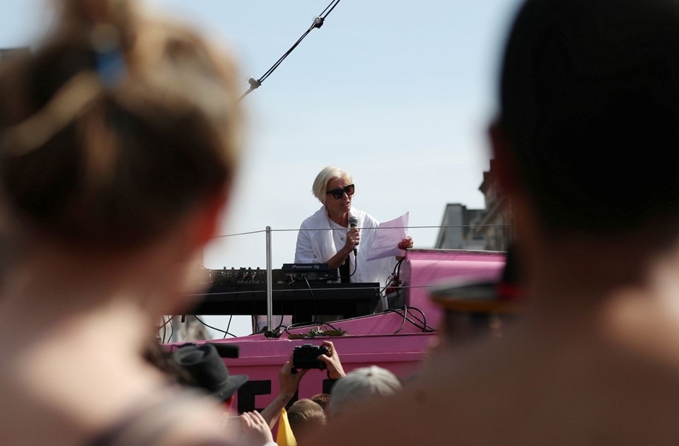Ünlü oyuncu Emma Thompson da protestoculara destek verdi. Küresel ısınmaya karşı verdiği mücadeleyle bilinen Thompson pembe tekneye çıkarak konuşma yaptı.