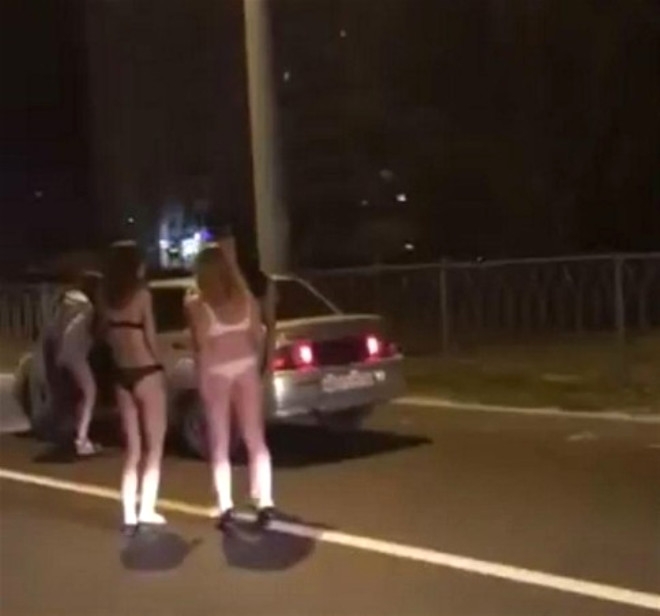 Yarı çıplak bir halde gece yol kesen kadınlar sürücüleri durduruyor.