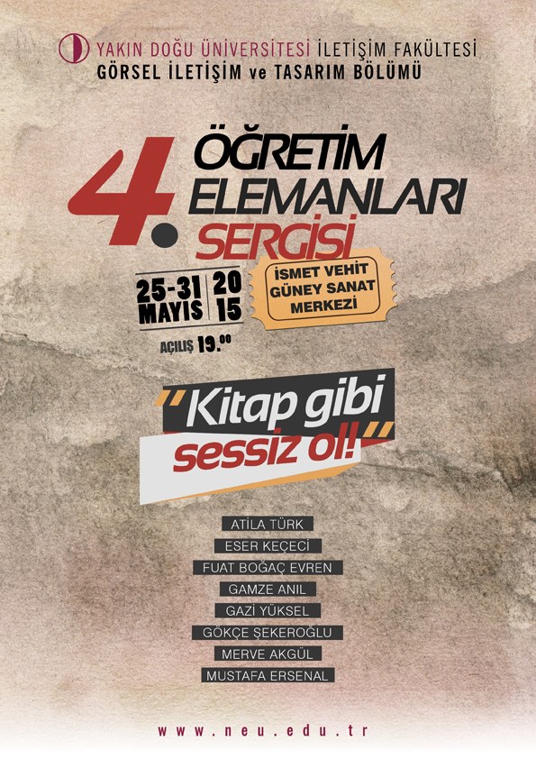 Yakın Doğu Üniversitesi,Kıbrıs (Near East University,Cyprus) Basın ve Halkla İlişkiler Dairesi Müdürlüğü'nden yapılan açıklamada, YDÜ İletişim Fakültesi bünyesinde bulunan birbirinden değerli öğretim üyelerinin çalışmalarının yer alacağı sergi, Doç. Dr. Atila Türk, Doç. Dr. Gökçe Keçeci Şekeroğlu, Öğr. Gör. Eser Keçeci, Öğr. Gör. Gamze Anıl, Öğr. Gör. Gazi Yüksel ve Öğr. Gör. Mustafa Ersenal, Arş. Gör. Fuat Boğaç Evren, ve Arş. Gör. Merve Akgül’ün çalışmalarından oluşuyor. “Kitap gibi Sessiz Ol” adlı 4. Öğretim Elemanları Sergi açılışı, İsmet Vehit Güney Sergi Salonu’nda 25 Mayıs 2015 Pazartesi günü saat 19:00’da yapılacak.