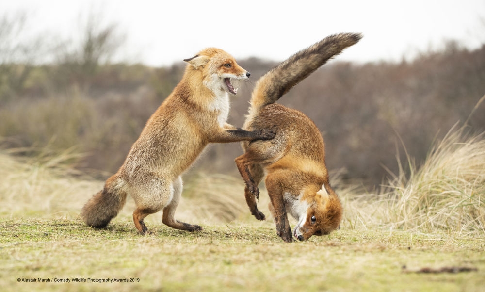 2019 Komik Vahşi Yaşam Fotoğrafları Yarışması'nda jürinin takdirine layık görülen İngiliz fotoğrafçı Alastair Marsh'ın görüntülediği iki tilki fotoğrafı.